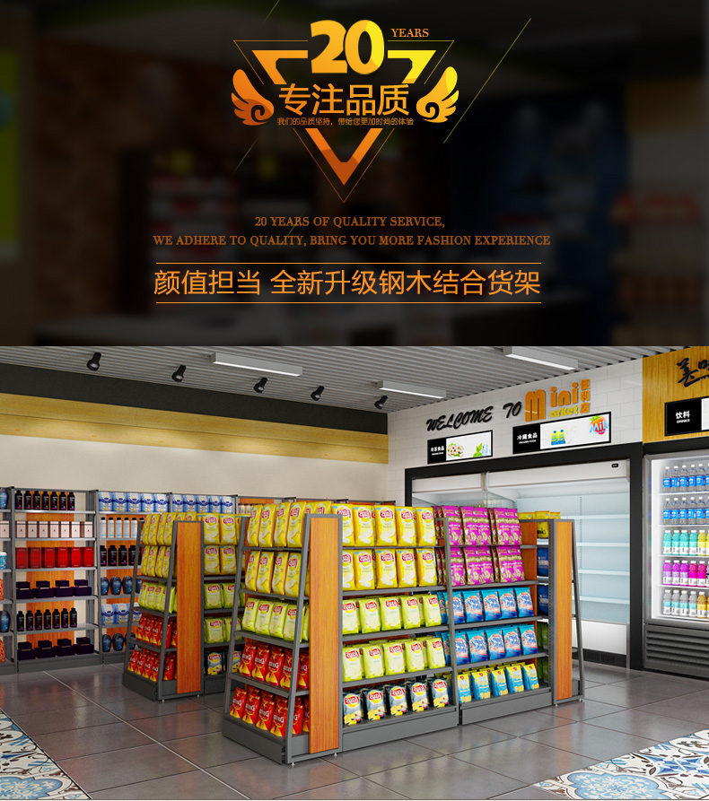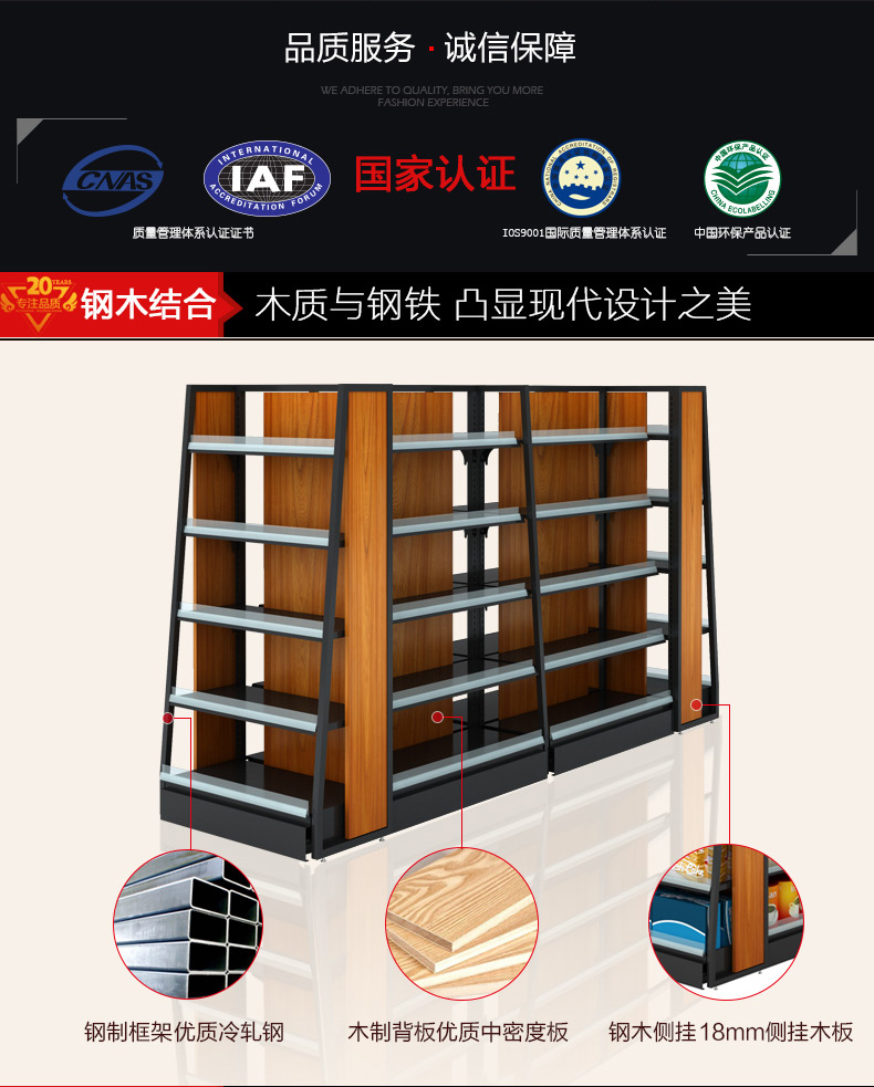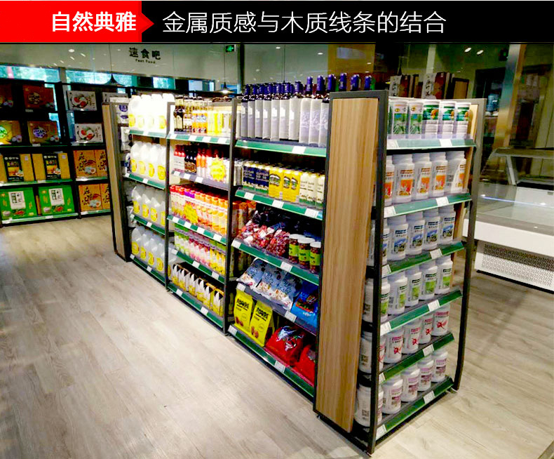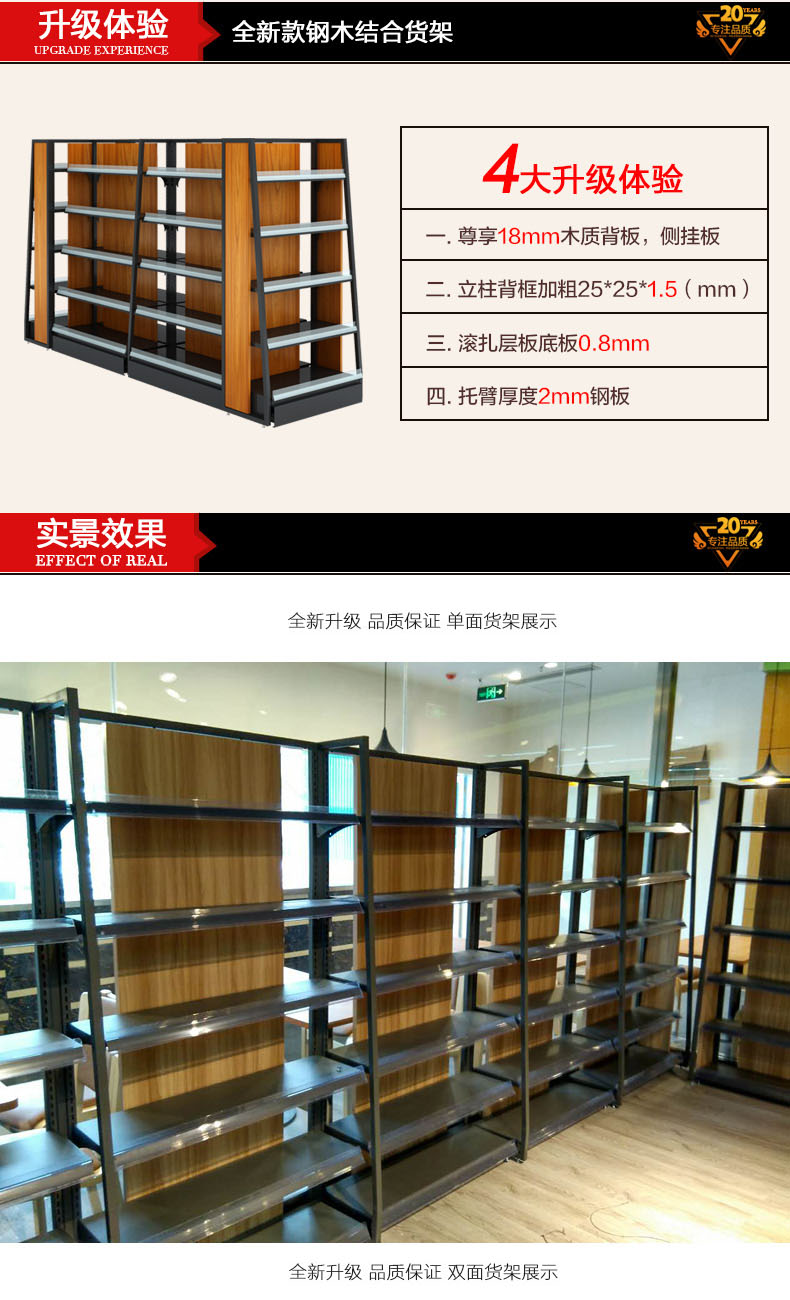 产品编号:Z_004 产品颜色:木纹色 使用场地:进口食品店、中小型超市、精品店,红酒店等高档场所 产品描述:新款钢木货架适用于进口食品店、中小型超市、精品店,红酒店等高档场所。 木纹颜色的多样性、钢制结构的组合的简易性、展示效果的高档性;木纹彰显高档与时尚。主要是由环保型木板材料,不存在变形现象;除了可以搭配商品的价目卡,还可以与商品结合式的POP广告和大型台架式POP广告等结合。