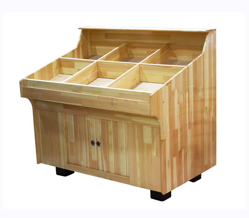 产品编号:Q-103 产品颜色:松木、橡木 使用场地:主要适用于蔬菜水果店,超市生鲜区域等场所 产品描述:木质果蔬架一般采用橡木或者松木板加工而成,木板表面为防划痕环保清漆,支腿采用注塑材质,五金件连接组合而成。木质果蔬架的特点是外观美观大方,适合于干货店粮米店以及果蔬店使用。