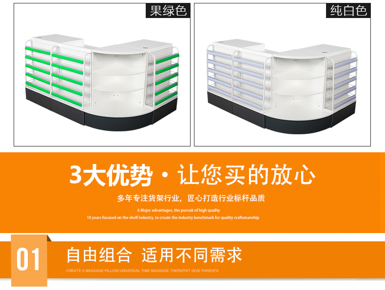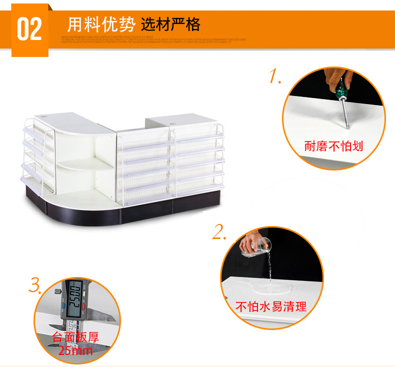 产品描述:Q-203款烤漆收银台主要以白色为主,烤漆板表面是经过抛光的,所以表面的光洁度很高,镜面效果也非常的好,这样的板材制作出来的收银台色泽比较鲜艳,贵气十足,给人带来很轻的视觉冲击力。 烤漆板材表面涂层固化后,其涂层的稳定性、耐久性、耐候性、耐摩擦性、耐腐蚀性和硬度都变高,由它制成的家具的结实耐用,表面有污垢后也容易清洁,不渗油,不褪色。
