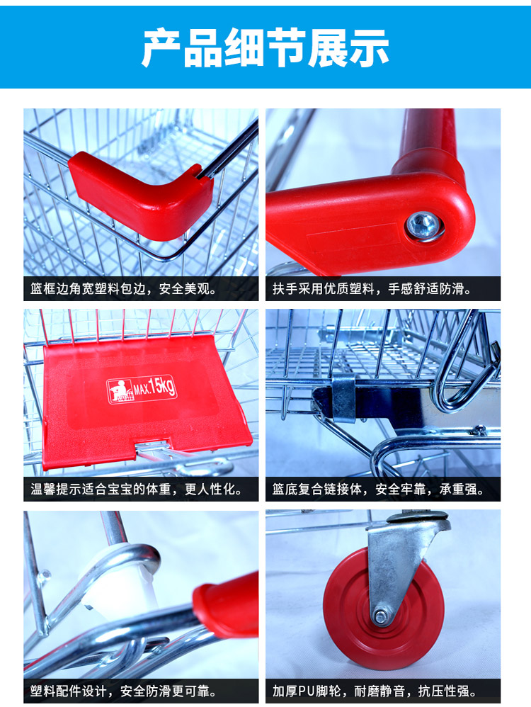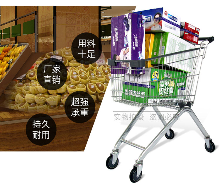 产品编号:Q-401 产品颜色:黑色、红色、绿色 使用场地:广泛用于超市、食品、电子、医药等各种企事业单位,几乎涵盖了整个供应链的各个环节。 产品描述:Q-401款人字购物车主要以银灰色为主,购物车是现代物流搬运行业和生产企业的必备搬运利器,是常见的工具车,节省人力,降低成本,提高效率。并且手推车的使用可以确保人员、物品在搬运中的安全。