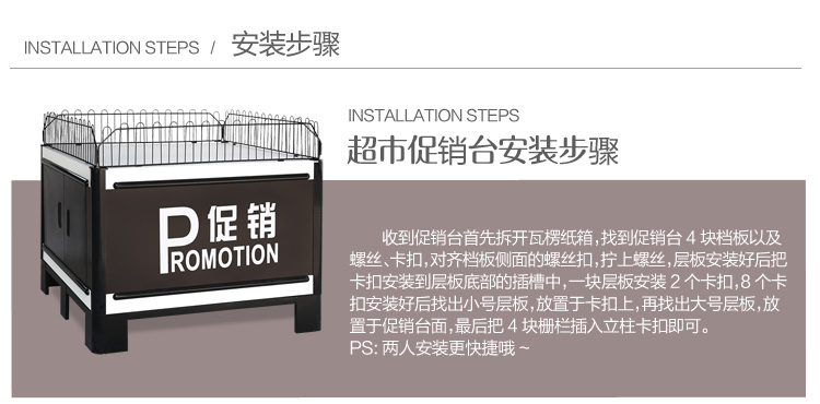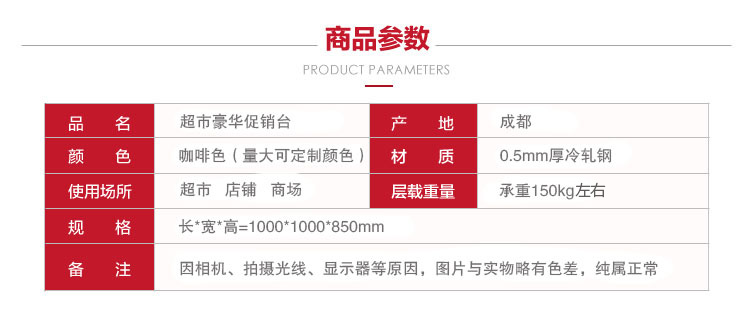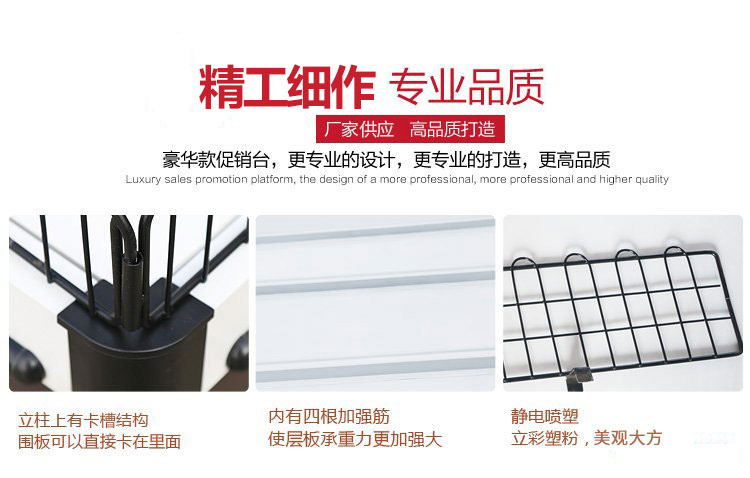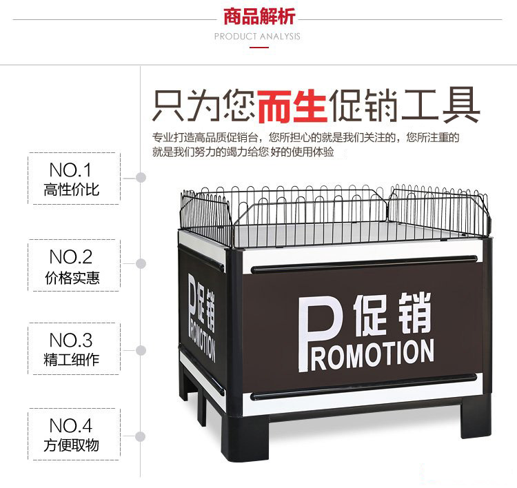 产品编号:Q-303 产品颜色:红色、咖啡+白、红色+黄、咖啡、白 使用场地:超市、便利店、药房、文体店、母婴店、精品店、商场等场所 产品描述:颠覆传统的促销台设计,更科学的设计,更人性化的设计。安装方便,只需要简单几个步骤就可以装好;携带方便:促销台可以折叠,折叠后占空间小;便于‘特别产品’的展示,尤其是新产品或者促销或者畅销产品。