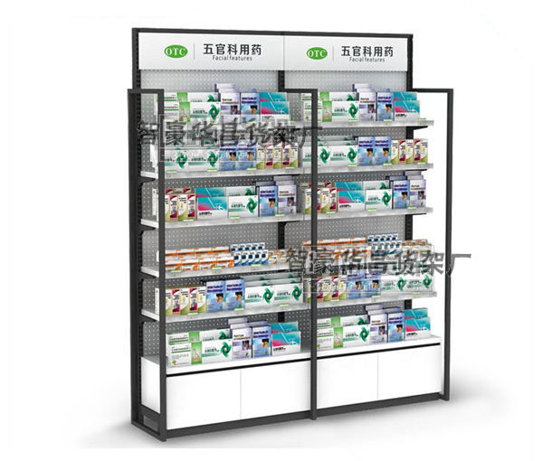 上图这是优质冷轧钢材精制而成的的药店处方药货架。由于处方药不能被随意购买的特殊性,所以处方药货架通常与处方药前柜组合使用,让药店处方药区域形成一个封闭式的环境,只留店员在这个封闭式的环境内,凭医生开具的处方药单据为顾客拿取所需药品。处方药货架需要靠墙摆放,而这款货架洞洞背板样式的设计能对墙面起到一定的遮挡作用,可以免去对墙面的装饰,既节省费用又不会影响店面整体的美观性。另外带地柜的设计使空间被很好地利用了起来。