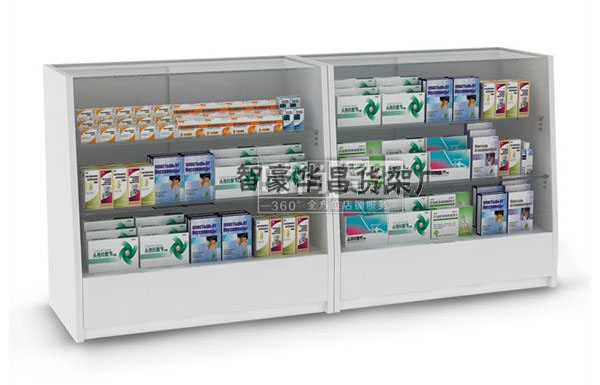 每个药店都会设置处方药区域,满足不同顾客群的药品需求。上图所示就是由时尚货架生产的药店处方药前柜。这款处方药货架整体材质为无异味无污染的高密度环保板,搭配清玻璃材质的层板及台面,既美观又实用。这款处方药前柜设计的巧妙之处就在于前柜背面的底部还设置了储存抽屉,方便存放一些畅销药品,利于随时进行补货,对处方前柜整体空间的利用发挥到了极致。