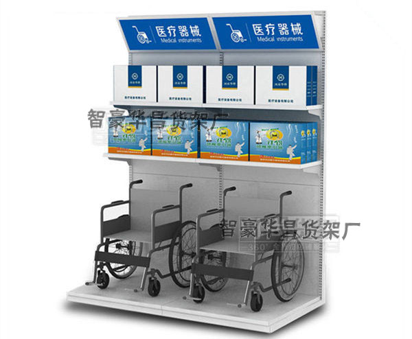 规模稍微大一点的药店一般都会设置一个医疗器械区,上图所示就是智豪华昌货架推出的大型医疗器械货架。大型医疗器械一般较重,所以对货架的承重性会有一定的要求。这款医疗器械展示架整体皆为优质冷轧钢材,耐磨抗压,承重有保障!智豪华昌货架生产的大型医疗器械架上面还配置了两层可随意调节高度的层板,便于用来陈列一些小型的医疗器械,节约了货架的空间资源,有加强了货架的陈列展示效果。